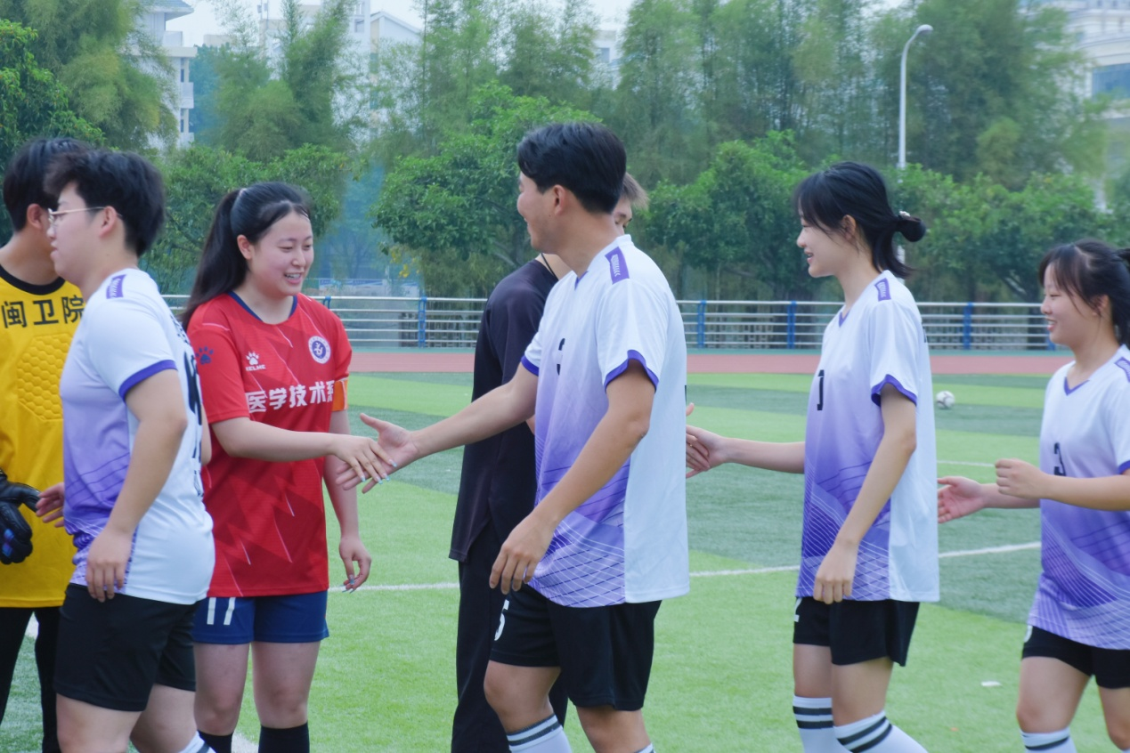 5月14日上午10:00,"用足球激荡热血,让运动点亮青春"主题的足球友谊赛顺利开展,福建卫生职业技术学院医学技术系党总支书记柯琼莺,福建省肿瘤医院放疗班班主任陈超老师,以及校企双方老师、50名观众观看了比赛。