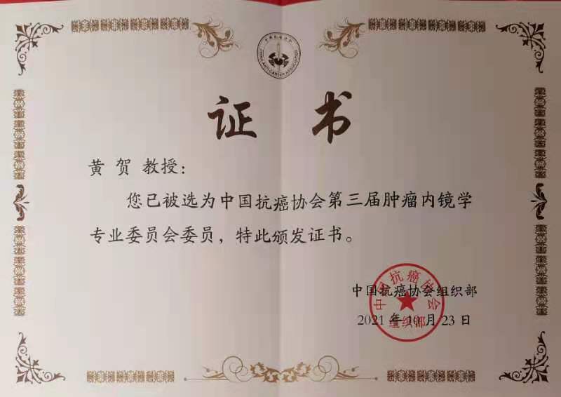 10月23日,中国抗癌协会肿瘤内镜学专业委员会全体会议在浙江杭州举行。会上,我院内镜中心主任施宏教授连任第三届委员会副主任委员,我院内镜中心黄贺副主任医师当选委员。