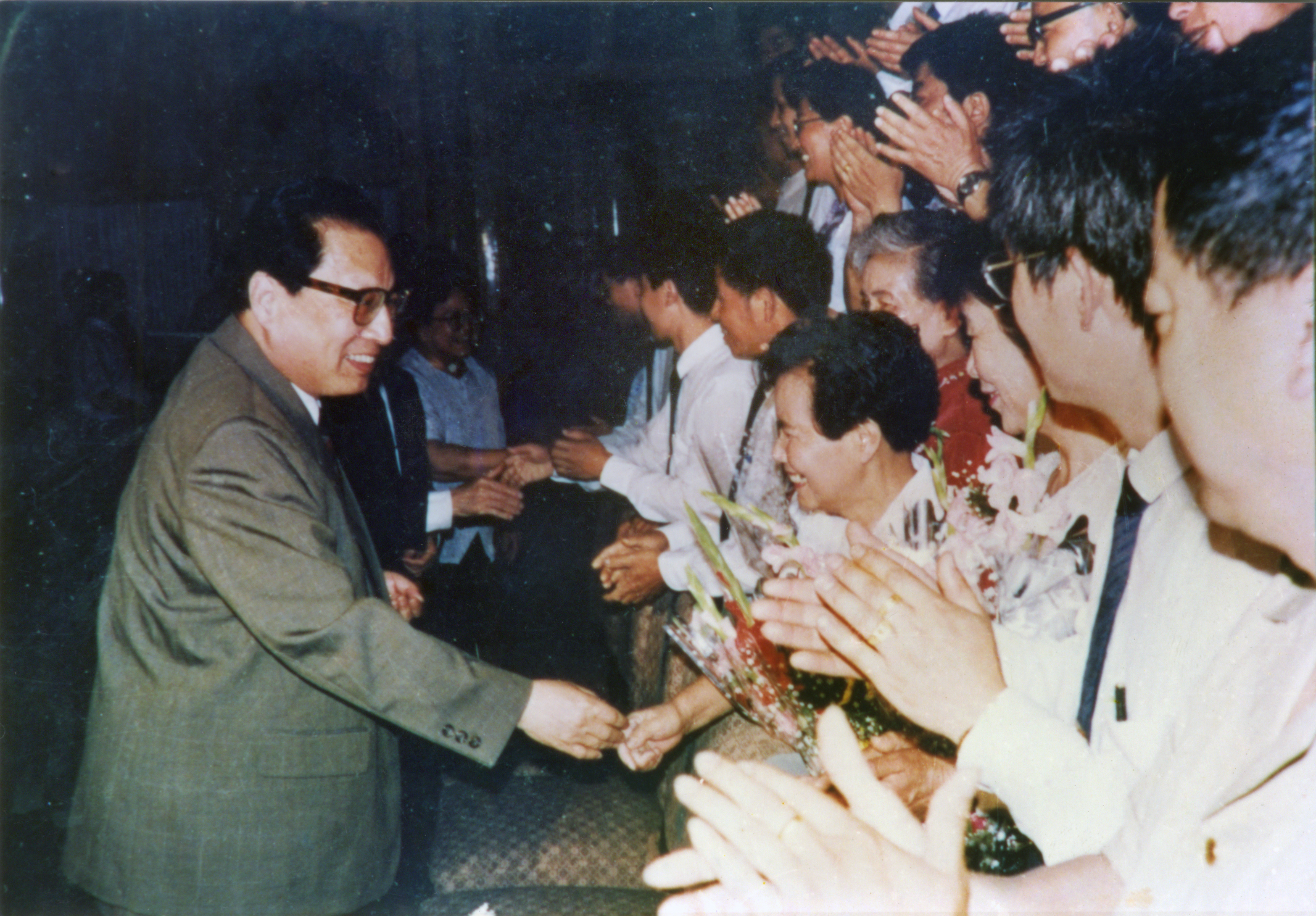 1993年,时任全国人大常委会委员长乔石接见第34届南丁格尔奖章获得者、医院护理部主任张瑾瑜(握手者)