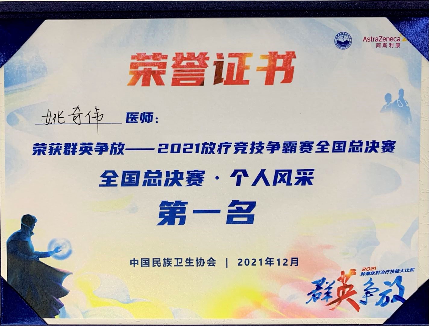 第二届“群英争放——肿瘤放射治疗技能大比武”全国总决赛于12月4日在济南举行。我院胸部肿瘤放疗科姚奇伟博士经过福建地区赛、华东区域半决赛的角逐后晋级决赛,并获得全国总决赛第一名的优秀成绩。