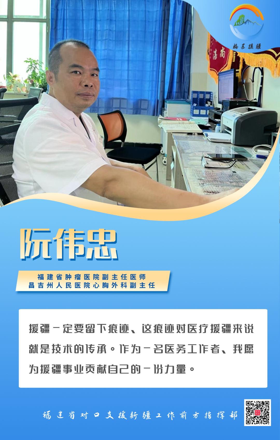 正是一批又一批像阮伟忠这样以“胡杨精神”为寄托的福建援疆人,艰苦奋进、不畏险阻,胡杨精神早已厚植在福建省援疆医疗队中,成长为庇护昌吉民众健康的一片绿荫。