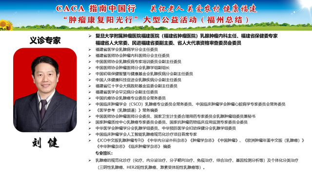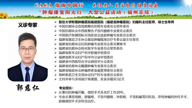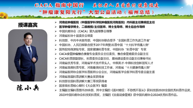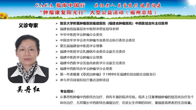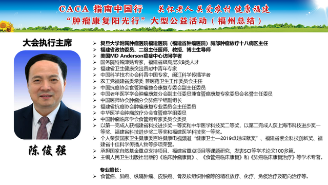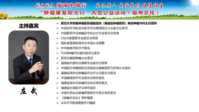 《CACA指南》立足中国人群、纳入中国研究、展现中国成果、兼顾医疗可及性、辐射基层、注重“防-筛-诊-治-康”全程规范管理,兼具中国特点和国际视野,是我国肿瘤学界最权威的指南,也是世界肿瘤领域的集大成者。为推动全国癌症防控事业发展的肿瘤指南规范体系,帮助广大医务工作者不断学习新理念、新技术、新疗法,掌握应用新药物,更好地服务患者;更能够帮助各医疗单位、医学院校、科研机构积极引入最新诊治理念、诊治技术,努力培养与临床应用接轨的高素质人才,中国抗癌协会联合相关单位在全国范围内,组织开展“CACA指南中国行”系列活动,掀起全国“学指南、用指南、遵规范”的热潮,助力并推动健康中国行动(2019—2030年)癌症防治目标的实现。“肿瘤康复阳光行”系列公益活动是省抗癌协会面向全省基层,主要聚焦服务老年和农村肿瘤患者,持续开展以“质量提升,规范先行”为主题的全省义诊及巡讲培训等科技志愿服务活动,活动旨在倡导积极预防癌症,推进早筛查、早诊断,降低癌症发病率和死亡率。