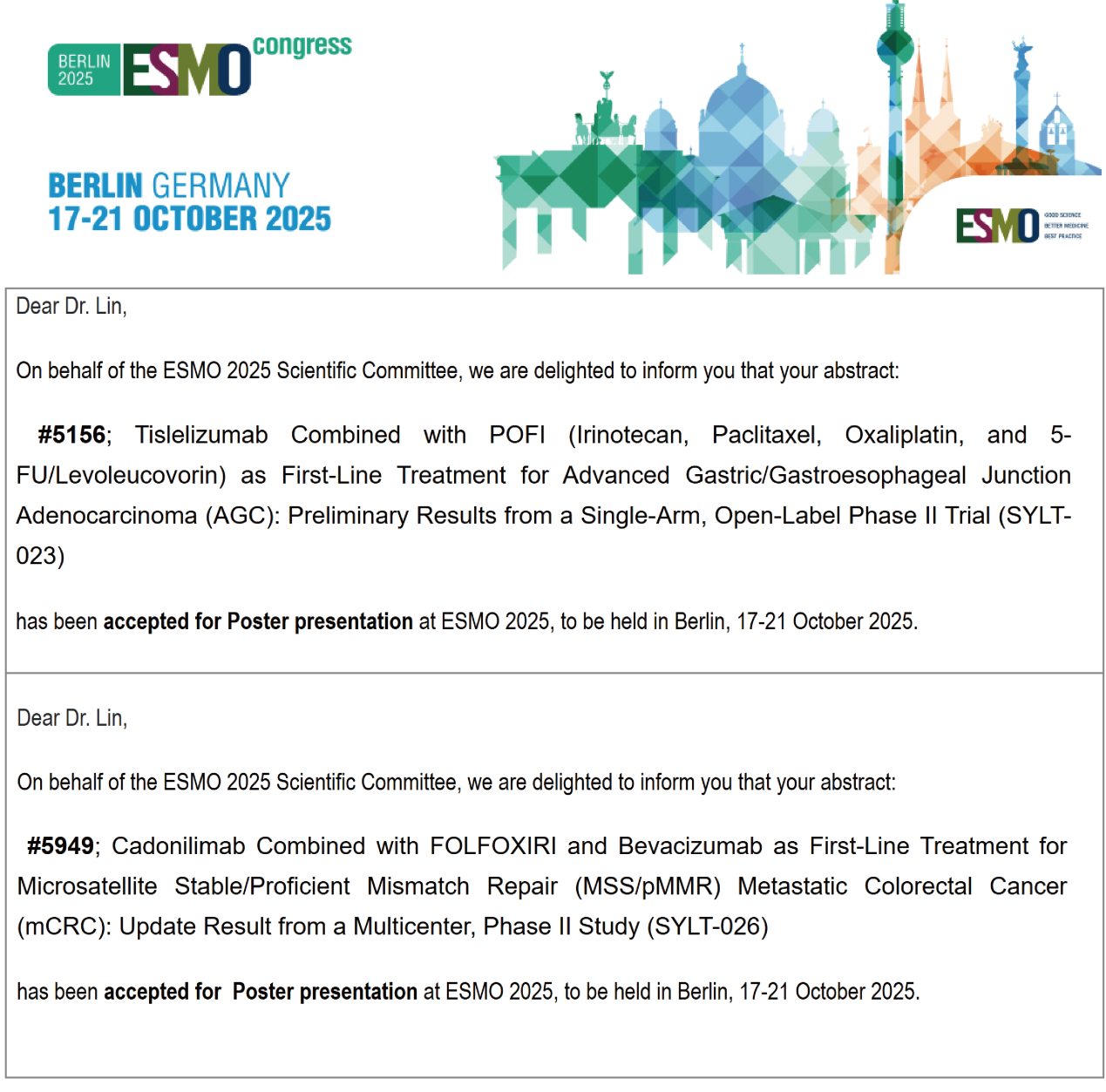 近日,我院胃肠肿瘤内科林榕波主任医师团队的两项研究成果《替雷利珠单抗联合POFI方案一线治疗晚期胃癌/胃食管结合部腺癌的单臂、开放标签II期研究(SYLT-023)》和《卡度尼利单抗联合FOLFOXIRI及贝伐珠单抗一线治疗MSS/pMMR转移性结直肠癌患者的多中心II期研究更新结果(SYLT-026)》成功入选2025年欧洲肿瘤内科学会(ESMO)年会壁报展示。