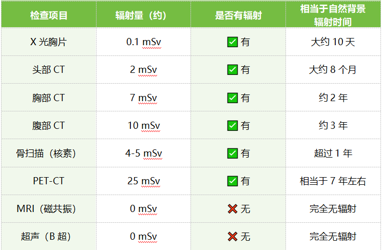 常见的影像检查中,像X光胸片,辐射量约0.1毫希弗,相当于接受10天的自然背景辐射;而MRI(磁共振)和超声(B 超)则完全无辐射,辐射量为0毫希弗。