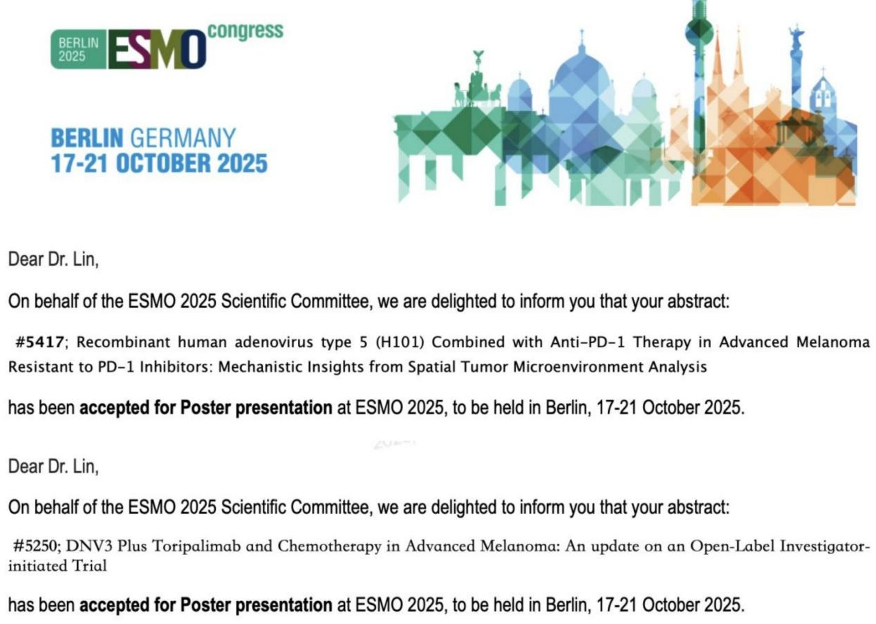 近日,我院黑色素瘤、泌尿软组织肿瘤内科陈誉主任医师、林晶副主任医师团队的两项研究成果《DNV3联合特瑞普利单抗及化疗治疗晚期黑色素瘤:研究者发起的单臂临床研究的数据更新》《重组人5型腺病毒(H101)联合抗PD-1疗法治疗PD-1抑制剂耐药的晚期黑色素瘤:基于肿瘤微环境空间分析的机制探索》成功入选2025年欧洲肿瘤内科学会(ESMO)年会壁报展示,标志着我院在难治性黑色素瘤治疗研究中的国际影响力进一步提升。