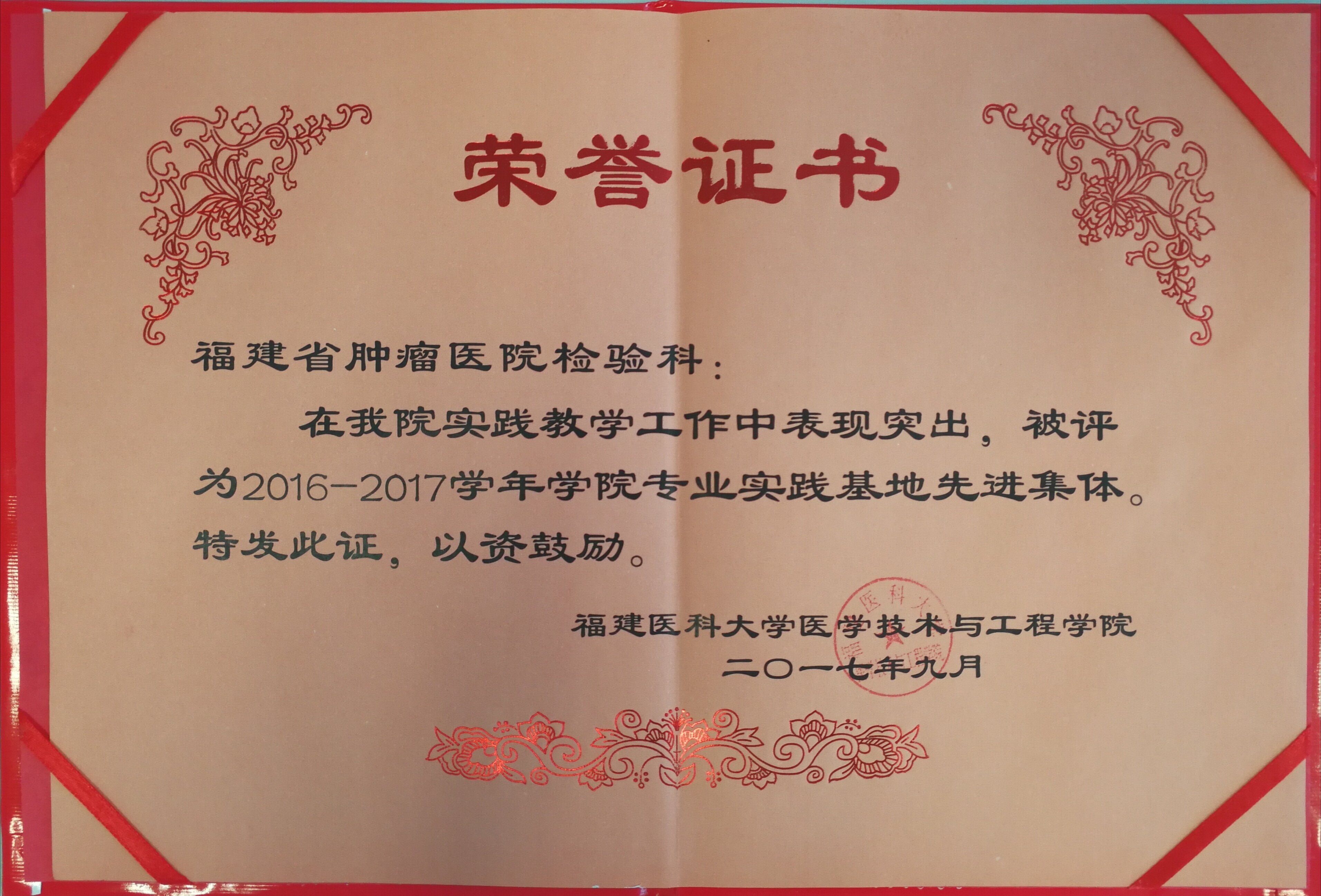 2017年9月18日下午,我院检验科在福建医科大学医学技术与工程学院召开的2017年度庆祝教师节暨表彰大会上被授予 “2016-2017学年专业实践基地先进集体”,这也是检验系15个专业实践基地中唯一的受表彰集体。同时检验科李丹老师也光荣地被评为“学院优秀论文指导教师”。