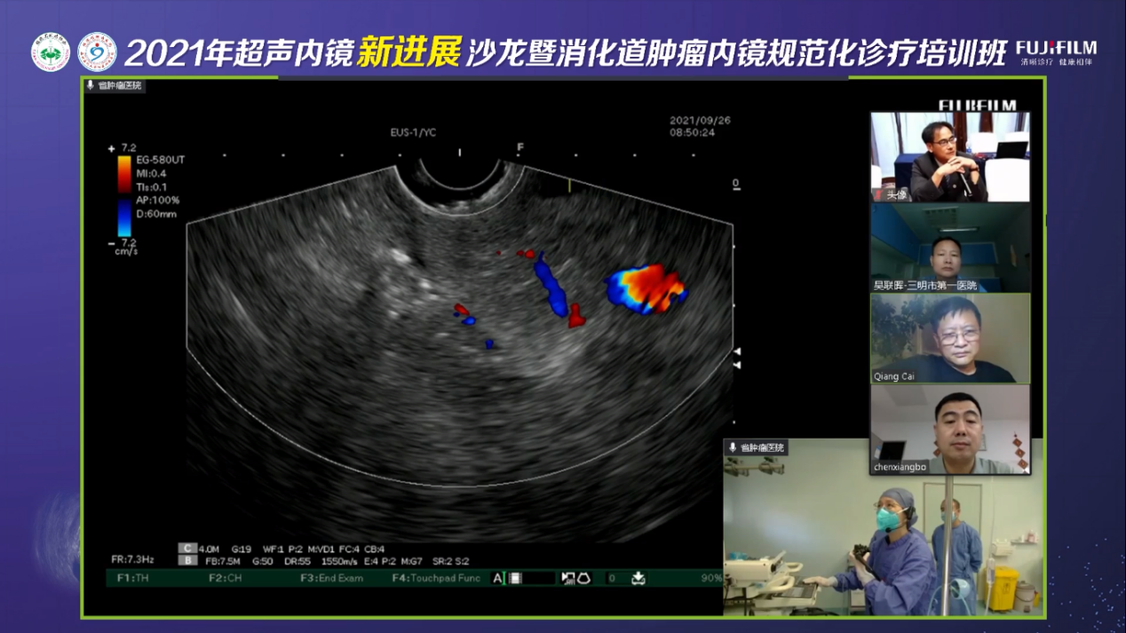 同时,会议期间由我院内镜中心谢招飞主任及陈素玉主任进行了超声内镜操作演示,通过联通5G网络远程转播系统及ZOOM与来至国内国际的著名超声内镜专家学者进行了实时远程操作演示和讨论指导交流。我院内镜中心黄瑞医生与来自厦门大学附属中山医院刘赟鹏医生,福建医科大学附属协和医院衷灿梅医生的进行了精彩的案例分享。