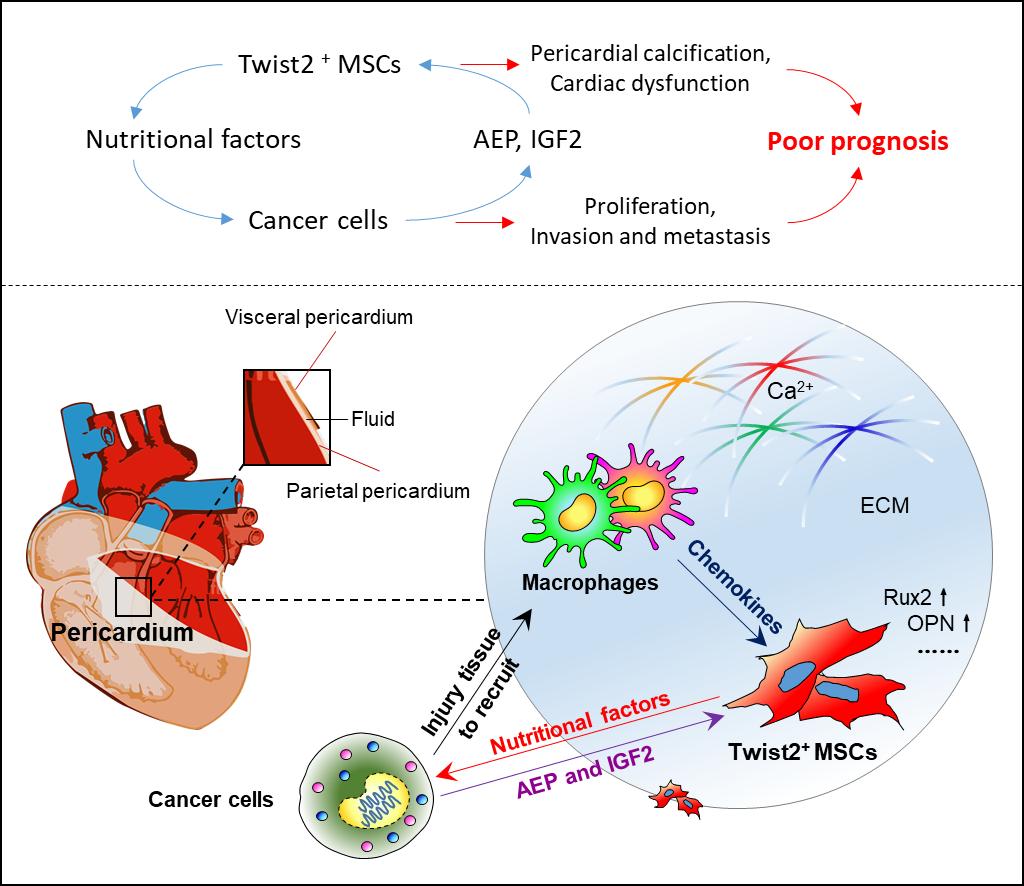 该项研究发现,心包钙化对于评估乳腺癌加速进展具有参考意义。近80%乳腺癌肺转移患者存在心包钙化,其发生率明显高于其他器官转移患者、未转移患者和良性乳腺疾病患者;心包钙化发生率与年龄、乳腺癌分子分型未体现关联性;心包钙化乳腺癌患者的无远处疾病生存期(Distant Disease Free Survival,DDFS)相较于无心包钙化患者明显缩短。心包钙化可导致心包硬化和增厚,限制心脏舒张并阻碍静脉血回流,增加心脏事件相关死亡风险。机制研究发现,乳腺癌小鼠心包钙化发生率与肺转移肿瘤负荷正相关,靶向巨噬细胞/间充质干细胞,以及整合素αvβ5/ IGF1R信号抑制心包钙化发生,改善心脏功能与预后。