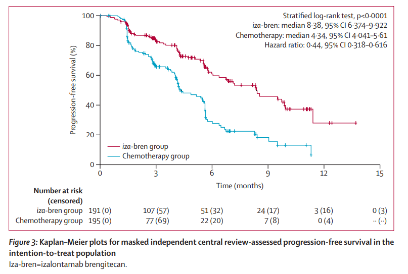 2.无进展生存期(PFS)近乎翻倍:iza-bren组中位PFS达到8.38个月,较化疗组的4.34个月显著延长,疾病进展或死亡风险下降56%(HR=0.44)。