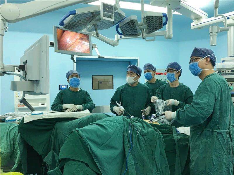 ▲在杨春康教授(左二)繁忙的工作中,总少不了腹腔镜微创手术