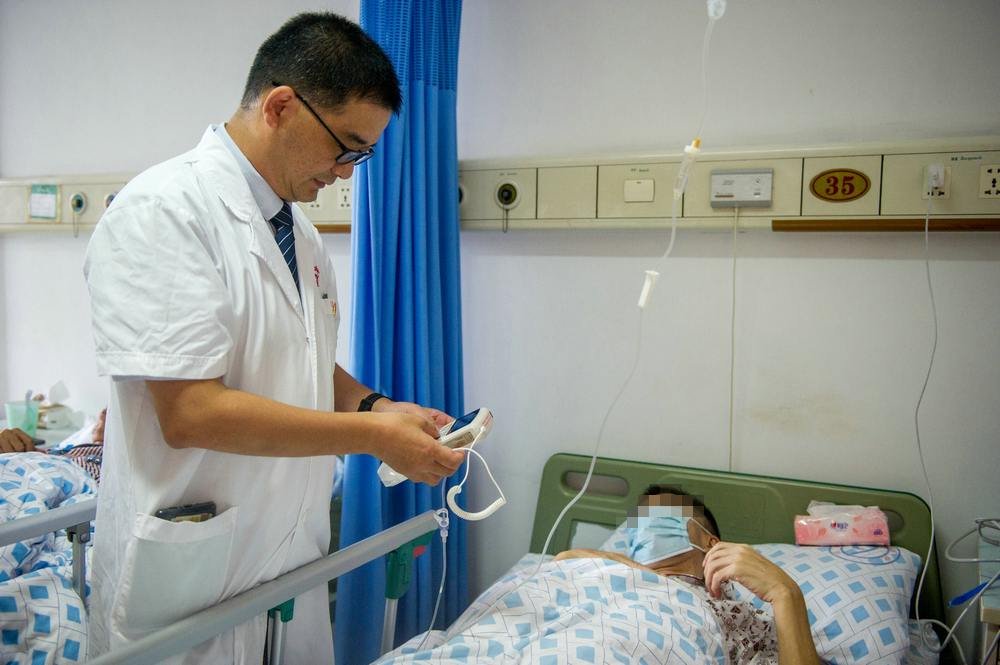 住进福建省肿瘤医院,老王的精神好多了 癌痛也是病不能光靠忍 林榕波为患者检查镇痛泵 精准治疗九成癌痛可控