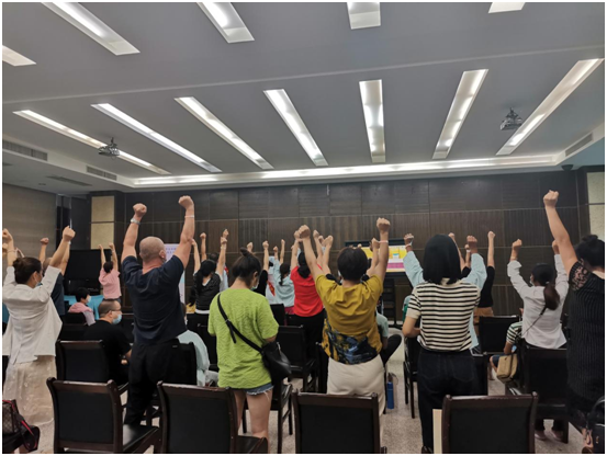 叶钦护士长结合数十年来的临床护理经验,详细介绍了甲状腺癌术后如何进行颈部功能锻炼,锻炼操以图文解说,结合视频,由护士们现场指导,亲身示范,病友们积极参与,将活动推向高潮。