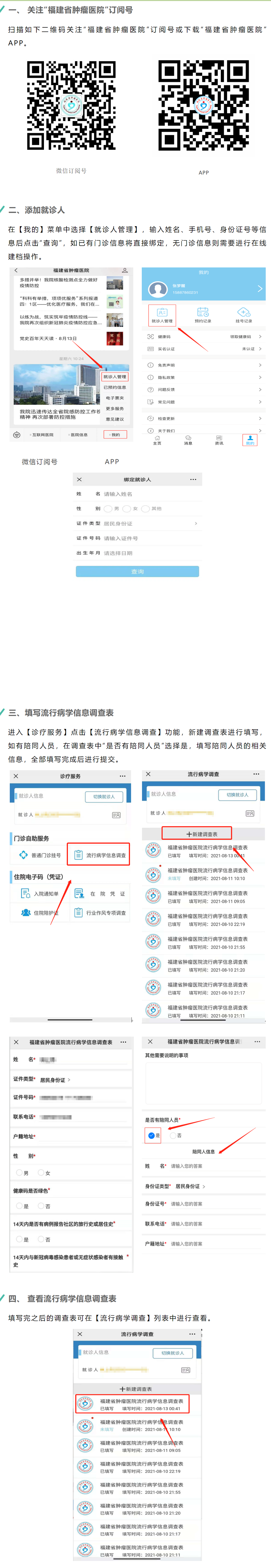 就诊人可在微信公众号订阅号“福建省肿瘤医院”和医院APP的“诊疗服务”——“ 流行病学信息调查”功能填写流行病学信息调查相关信息,陪同人员信息也可一同填写。