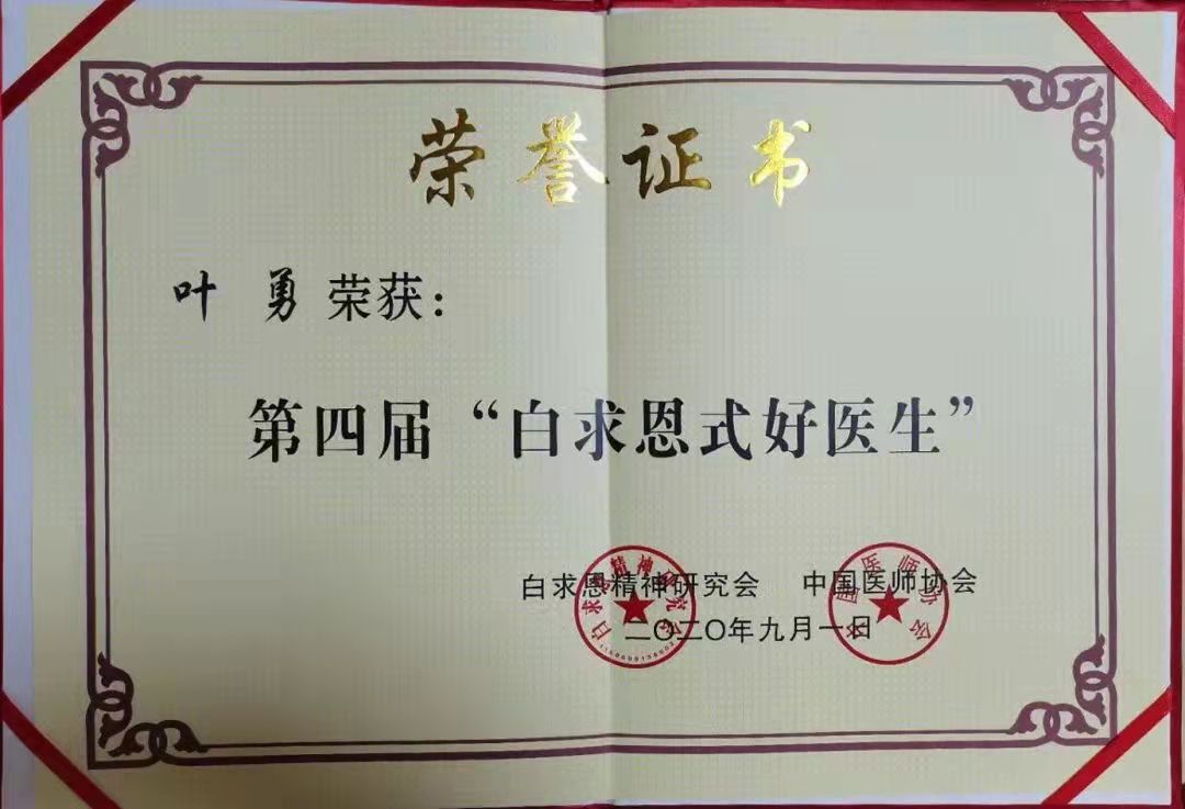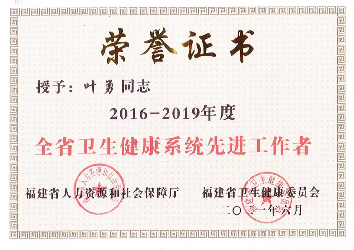 因工作突出,近年来,叶勇先后获得“全省卫生健康系统先进工作者”“福建省最美医师”“白求恩式好医生”“福建医科大学优秀教师”“福建医科大学最美逆行者”“福建省肿瘤医院疫情防控青年先锋”等荣誉。
