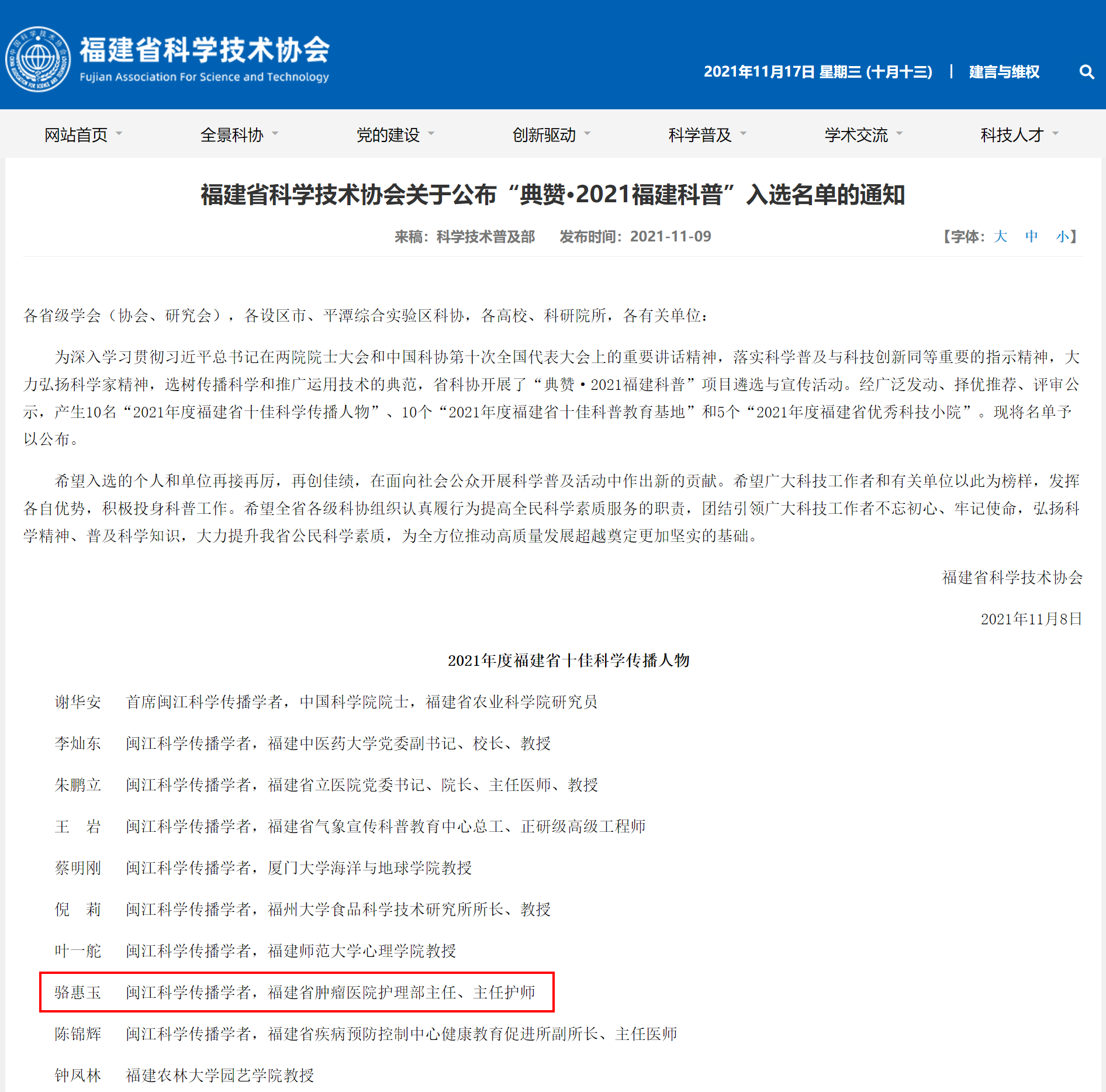 日前,福建省科学技术协会公布了“2021年度福建省十佳科学传播人物”名单,我院护理部骆惠玉主任光荣当选。