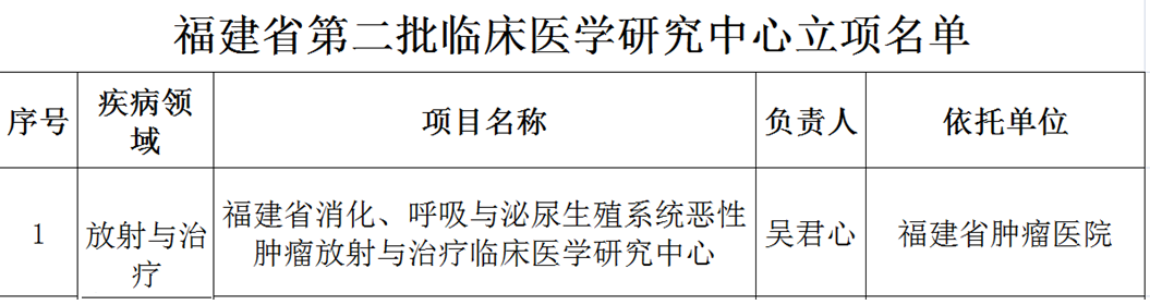 近日,福建省第二批临床医学研究中心项目公布,我院放疗科在学科带头人陈传本院长、潘建基教授及吴君心主任带领下,继去年获批“福建省肿瘤放射与免疫治疗临床医学研究中心(负责人:陈传本教授)”后,再次荣膺“福建省消化、呼吸与泌尿生殖系统恶性肿瘤放射与治疗临床医学研究中心(负责人:吴君心教授)”,显示了我院在恶性肿瘤精准放疗研究领域的强劲研究实力。