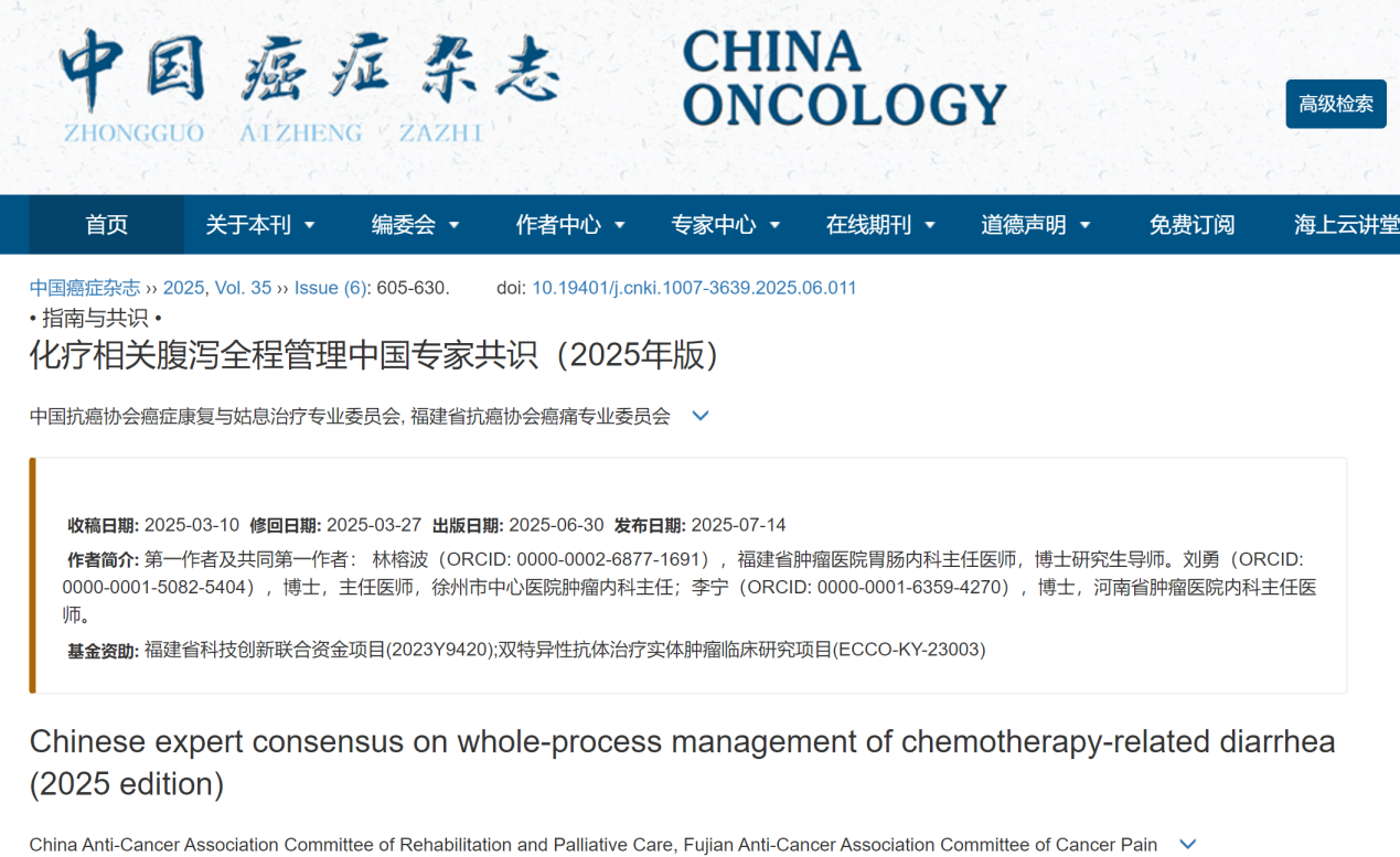 7月14日,由我院胃肠肿瘤内科林榕波主任医师牵头制定的《化疗相关腹泻全程管理中国专家共识(2025年版)》在《中国癌症杂志》正式发布。该共识由全国25个省市60余名多学科专家共同参与,旨在为临床提供科学、规范的化疗相关腹泻全程管理方案,进一步提升抗肿瘤治疗的安全性和患者生活质量。