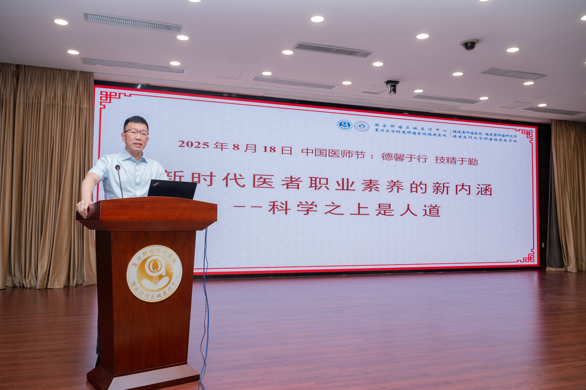会上,院党委书记刘景丰作题为《新时代医者职业素养的新内涵——科学之上是人道》的专题讲座。结合今年医师节主题“德馨于行,技精于勤”,深刻阐述新时代赋予医务工作者的责任与担当,号召全院医师以红医精神为指引,以裘法祖、吴孟超、陈国熙、陈孝平等医学前辈为榜样,坚持以人民健康为中心,崇尚医德、钻研医术、秉持医风、勇担重任,筑牢理想信念,恪守职业准则,将个人成长融入医院高质量发展和健康中国建设大局,为护佑人民健康、推动医院发展再立新功。