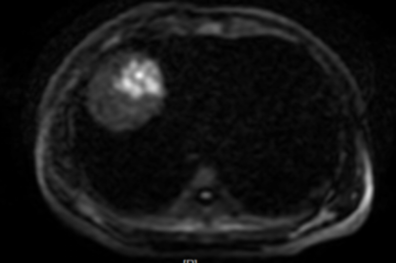磁共振检查显示肿瘤位处肝脏膈顶部