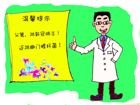 随着文明的发展,卫生意识的不断提升,合餐制的弊端日益显现,传统的合食习惯带来的最大问题就是人与人唾液的“传播交流”。呼吸道飞沫就能传播疾病,可想而知“唾液”带来的危害更加严重。唾液是多种致病原的载体,可传染多种疾病。合餐制的一大危害就是容易传染各种消化道传染病,呼吸道传染病。在人群中传播最多的是乙肝病毒和幽门螺杆菌。我国是胃癌高发国家,每年有近20万人死于胃癌,而胃癌的元凶就是幽门螺杆菌(HP)。