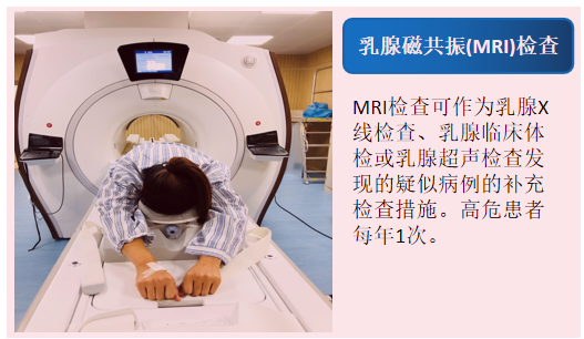 乳腺癌高危人群提前进行筛查(小于40岁),筛查频度推荐每年1次,筛查手段除了乳腺X线检查之外,还可以采用MRI等影像学手段。